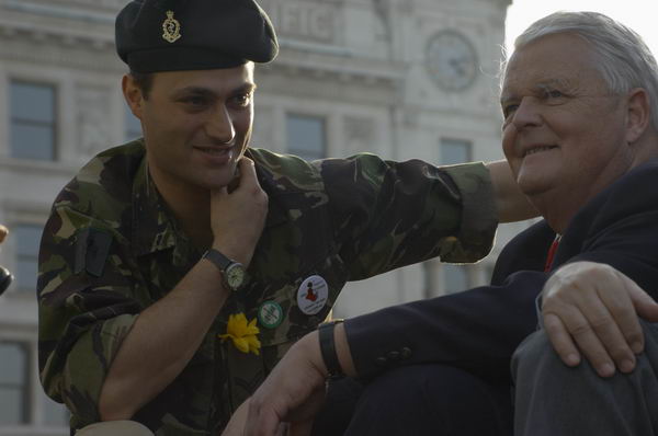 ![]() George Solomou talking to Bruce Kent on the plinth at Trafalgar Square. |