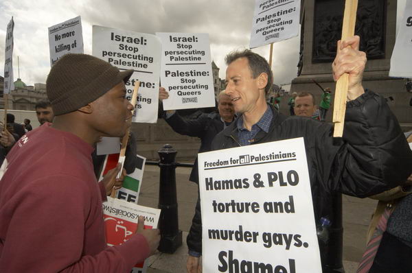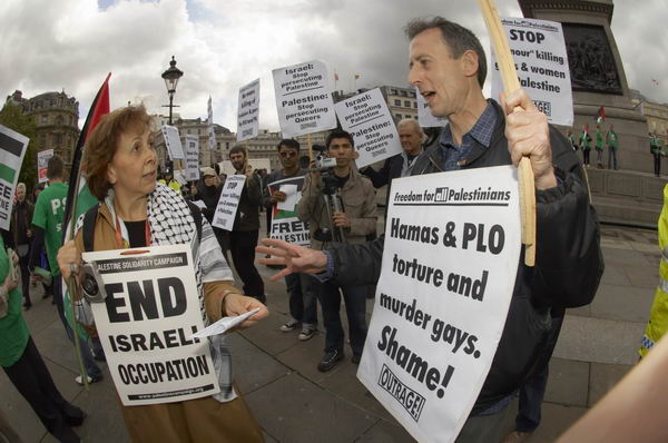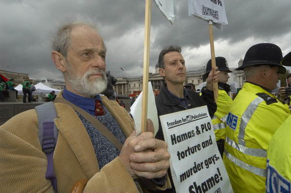 ![]() A demonstrator talks to Peter Tatchell ![]() |