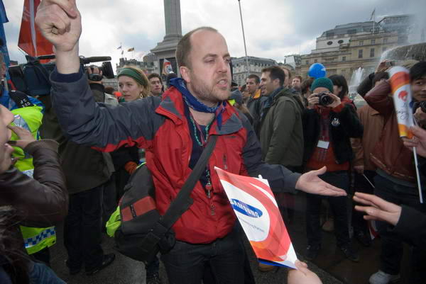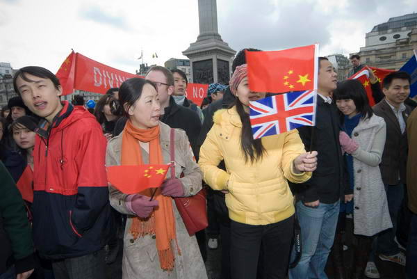 ![]() One of many groups of young Chinese supporters arguing with human rights protesters in Traflagar Square |