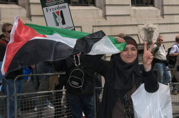 ![]() Young Muslim woman with Palestinian flag and a familiar 'Victory' sign |