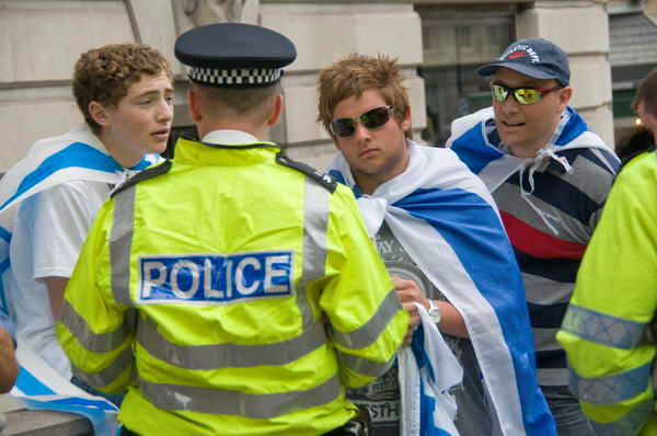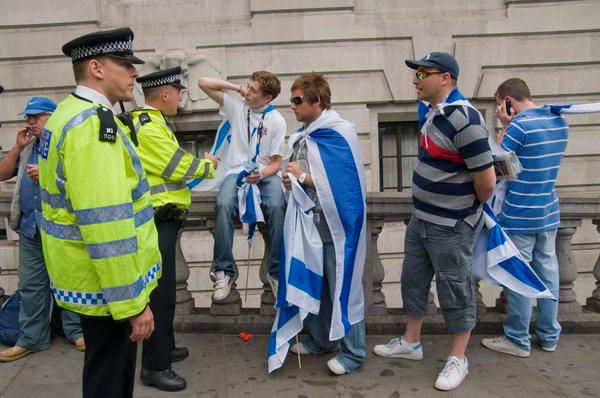 ![]() This policeman is about to tell the people with Israeli flags to stop being a nuisance and move away |