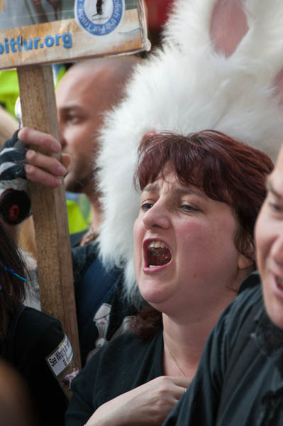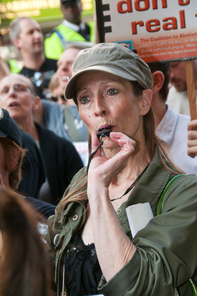 Making a noise outside Harrods - called 'Horrids' on some of the posters.