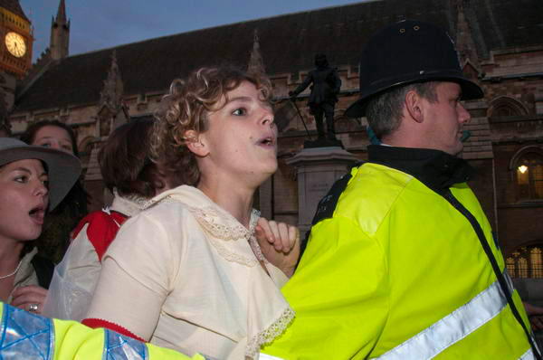 Tamsin Osmond looks jubilant as the Climate Rush reaches the Houses of Parliament