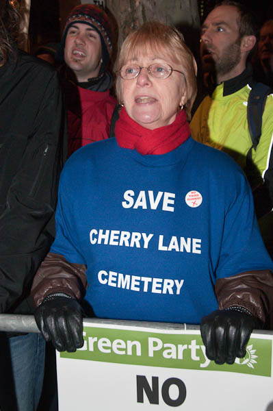 John McDonnell speaks. A protester with a 'Save Cherry Lane Cemetery' sweat shirt