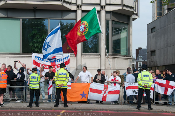 EDL portesters with variations on the English flag, as well as Israeli and Portuguese flags