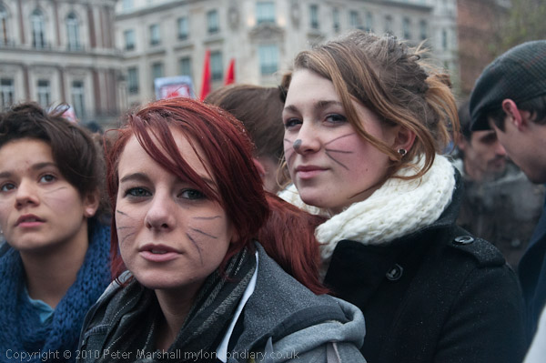 Back at Trafalgar Square, there is a good line of police across Whitehall, but people are walking through unchallenged