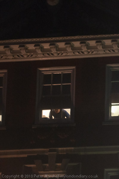 People peer out of the windows of the Lib Dem HQ to see the protest