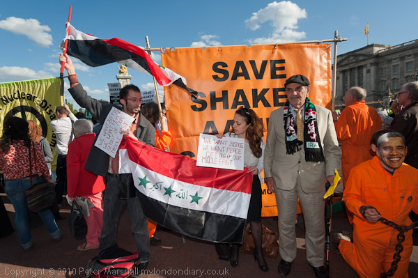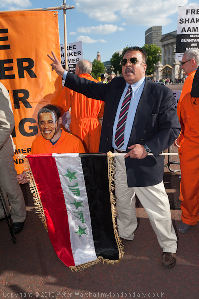 ![]() A small group were calling for the US to get out of Iraq, and posed with 'Obama' in chains for the Shaker Aamer campaign ![]() ![]() ![]() ![]() A demonstrator with the message 'House of Saud is Abode of Terrorism' |