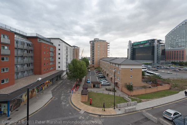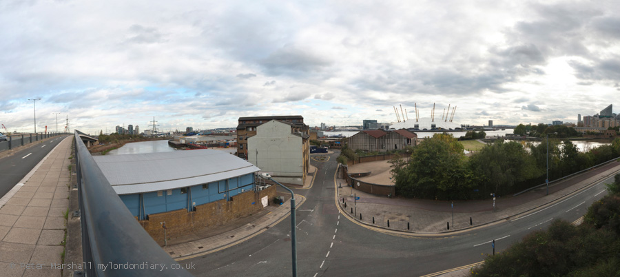 Roughly 180 degree view from the Lower Lea Crossing with Orchard Place in the middle