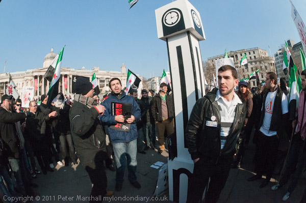 ![]() ![]() ![]() Syrians dance around the 'Homs' clock in Trafalgar Square ![]() And stamp on the face of War Criminal President Asad ![]() |