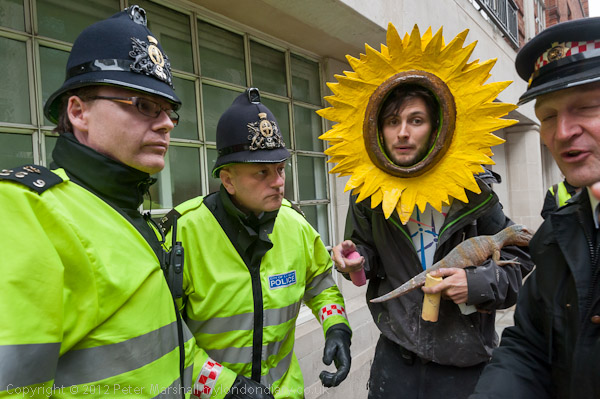 Police talking to a man dressed as a sunflower and holding chalk and dinosaur