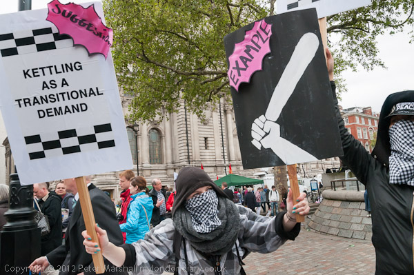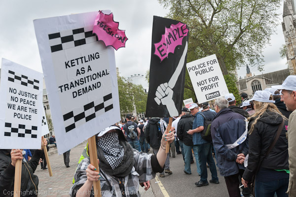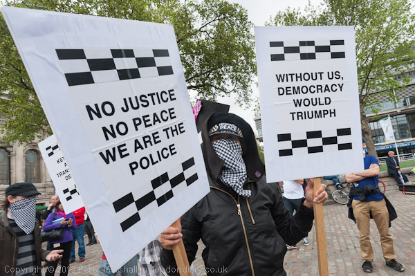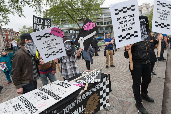 A police line in front of the 'Defend the Right To Protest' banner - another piece of intimidation