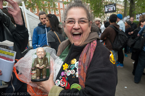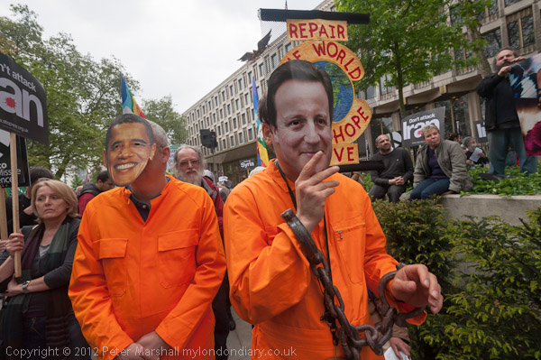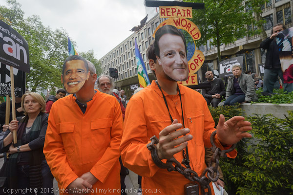 Campaigners for the release of Shaker Aamer wearing Cameron and Obama masks