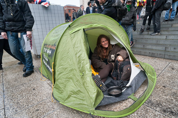 Outside a small group were sheltering in a tent, though the rain had more or less stopped