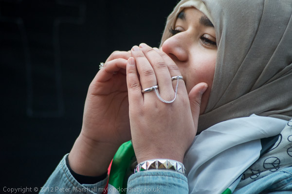 ![]() ![]() ![]() A Victory sign and a 'Boycott Israel Goods' sticker ![]() ![]() A young woman leaning back to shout at the Israeli embassy ![]() ![]() |