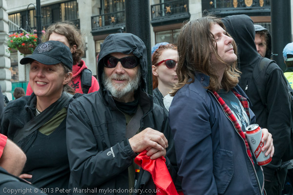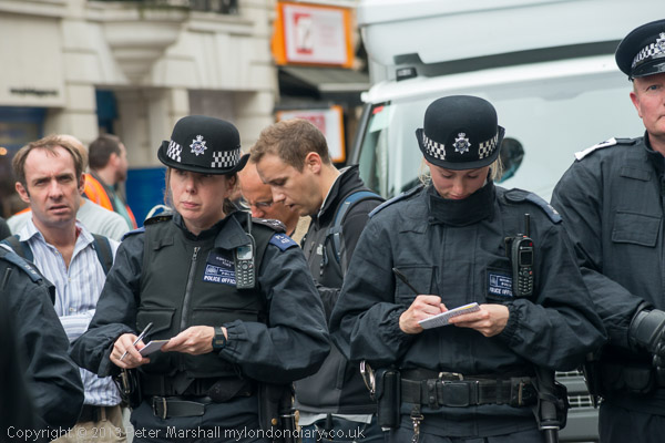 A line of police across Piccadilly watched the protesters, some making notes