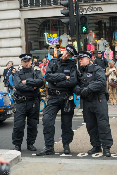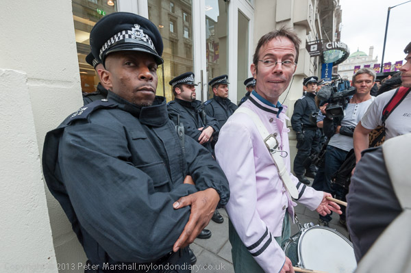 A police officer comes to tell the protesters they need a licence to play music on the street in Westminster