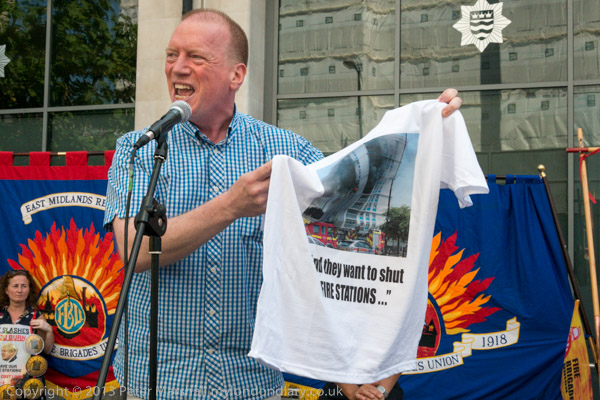 Matt Wrack holds up one of the t-shirts showing a blazing tower block "And they want to shut FIRE STATIONS"