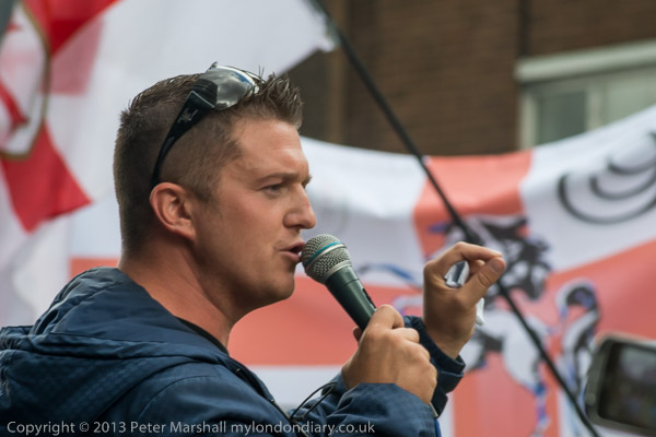 A woman with the EDL Newcastle Division flag watches Tommy speaking