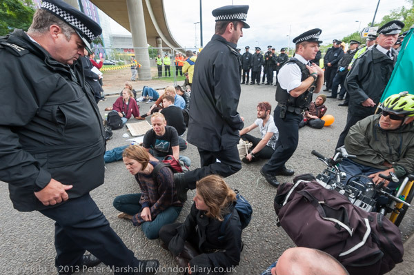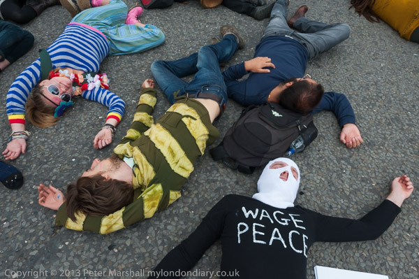 Soon there are quite a few people feigning dead on the road outside the gate to the ExCel centre