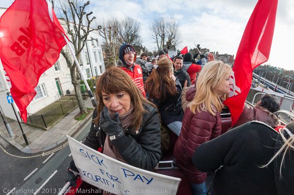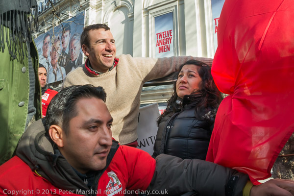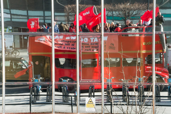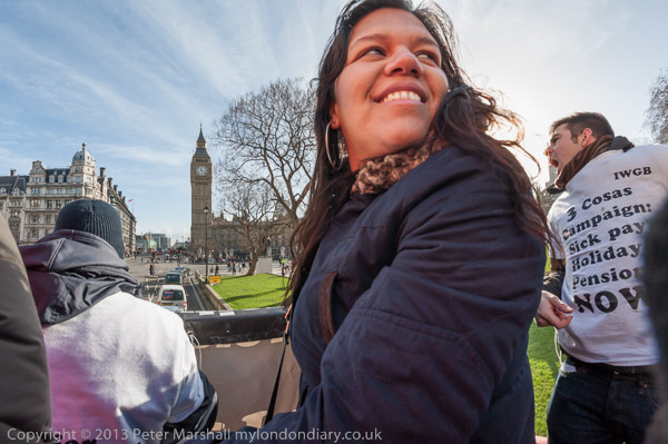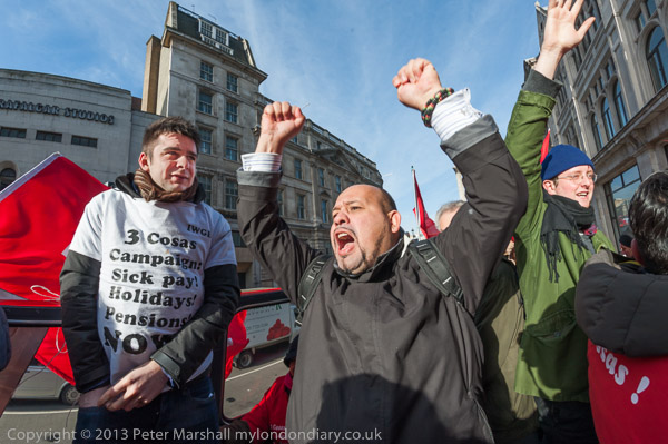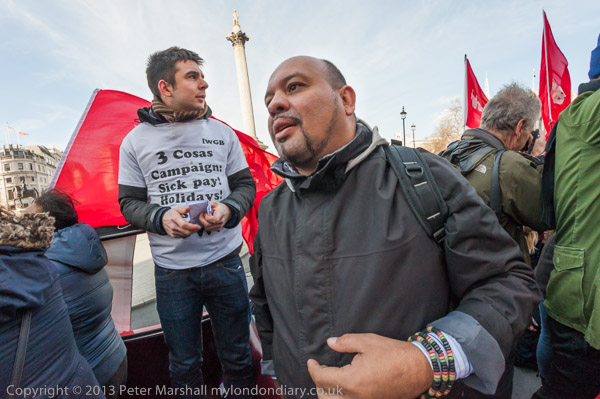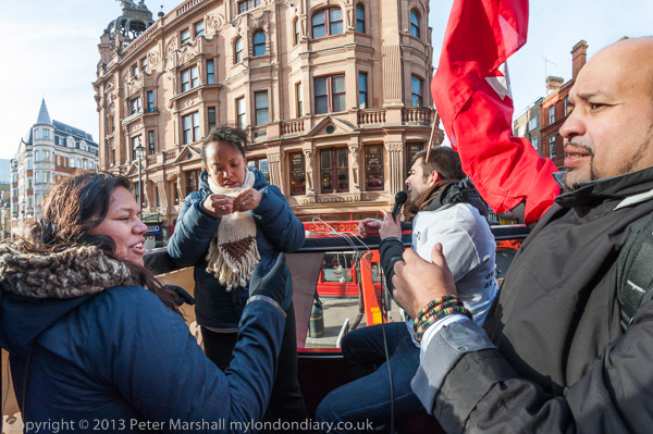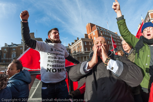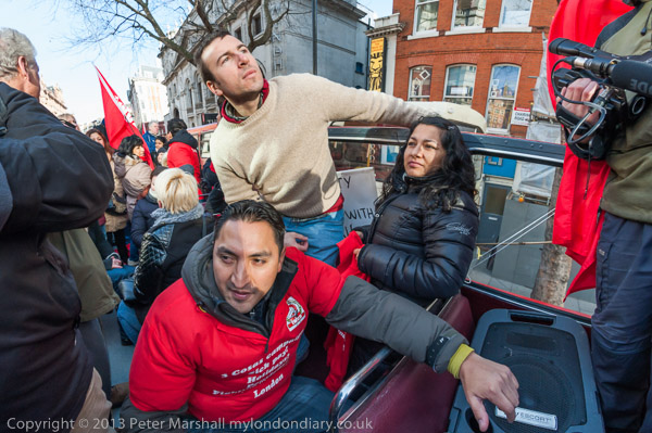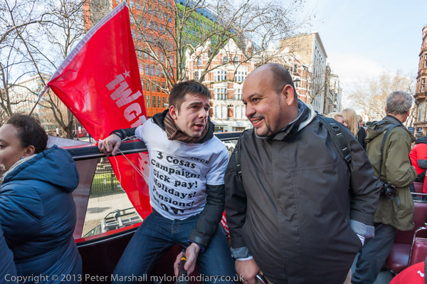 '3 Cosas' Strike IWGB Battle BusSenate House to Parliament Square, London. Tue 28 Jan 2014 |