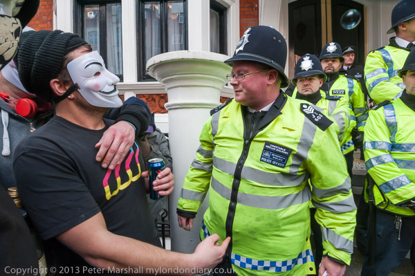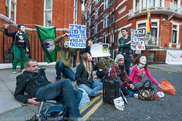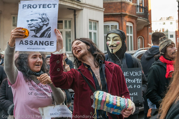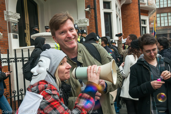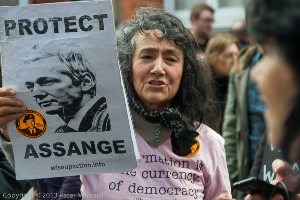 In front of the Ecuadorian embassy calling for Assage to be allowed to leave and go to Ecuador