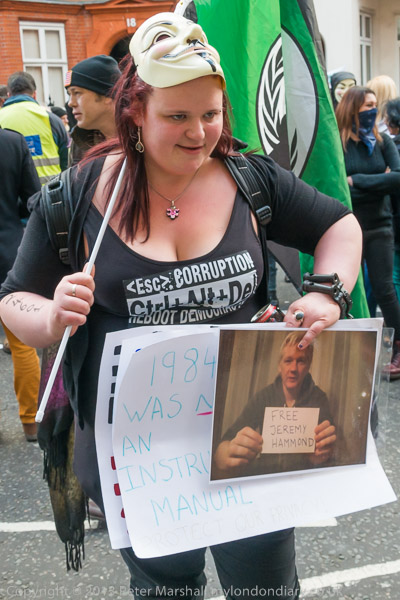 A woman in the '<Esc> CORRUPTION - Ctrl+Alt+Del - REBOOT DEMOCRACY'  t-shirt holds an Anonymous flage in front of the Embassy sign