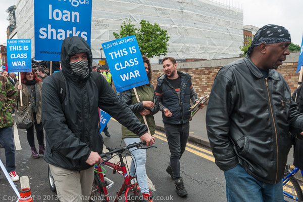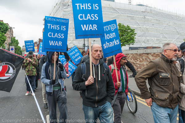 with placards for their protest at Wonga after the march and rally
