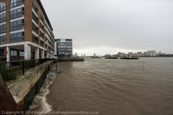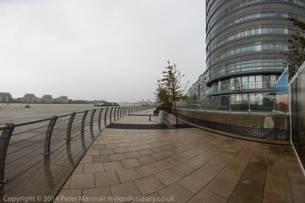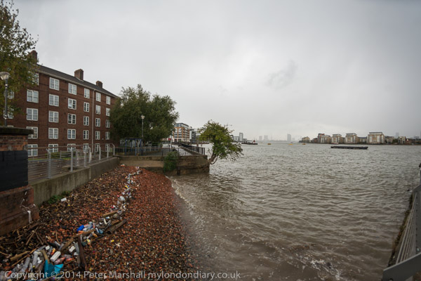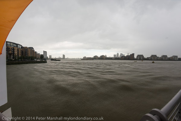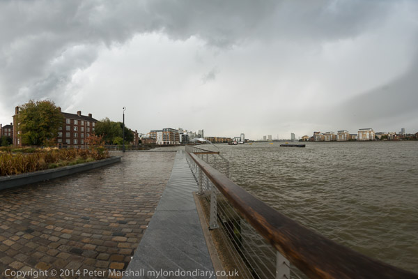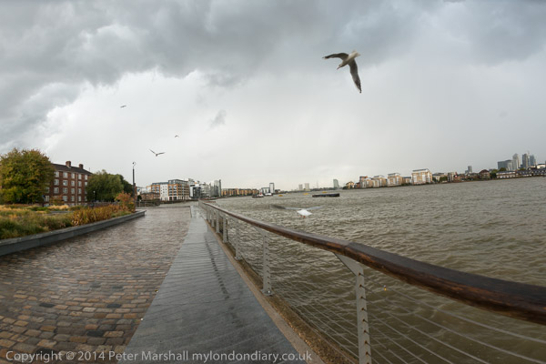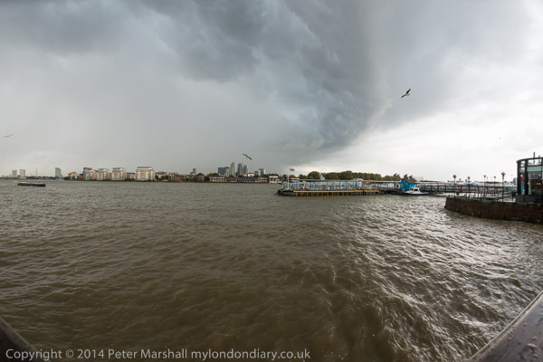 Rain pounding on the river, and squalls blowing my umbrella into the frame
