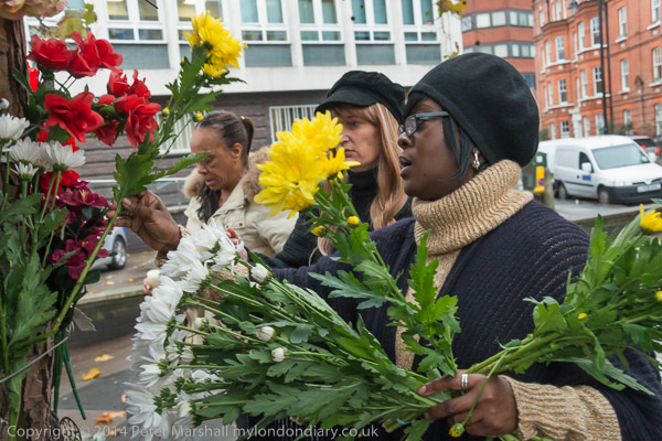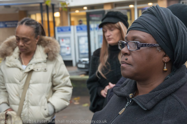 People stand in silence remembering Ricky Bishop and others killed by police at Brixton Police Station