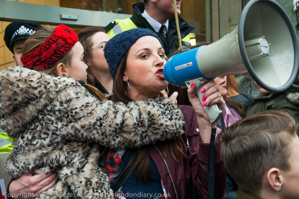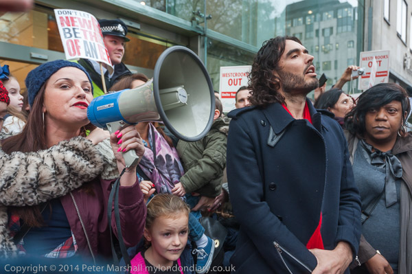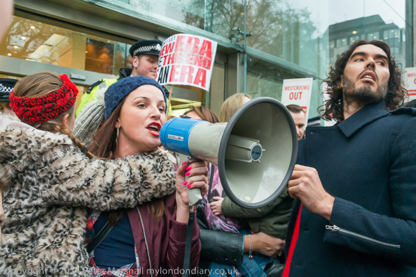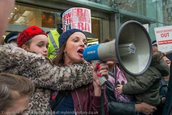 Lindsay Garrett, one of the founders of NewEra4All speaks in front of the Berkeley Square House offices of Westbrook