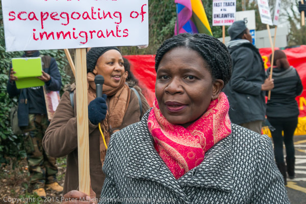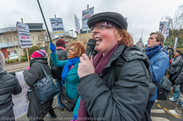 Karen Doyle of Movement for Justice speaks and leads some chanting calling for an end to Fast Track