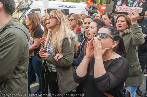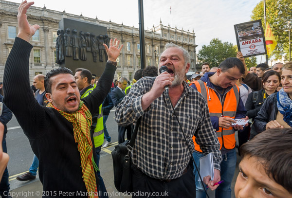 Peter Tatchell holds a poster 'Solidarity with Kurds & Turks against AMP & Erdogan'