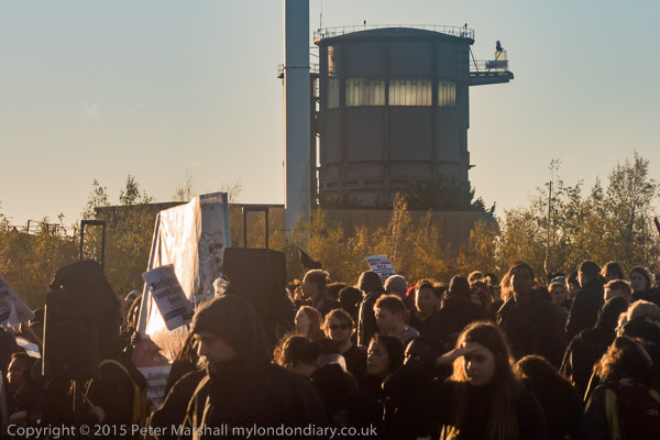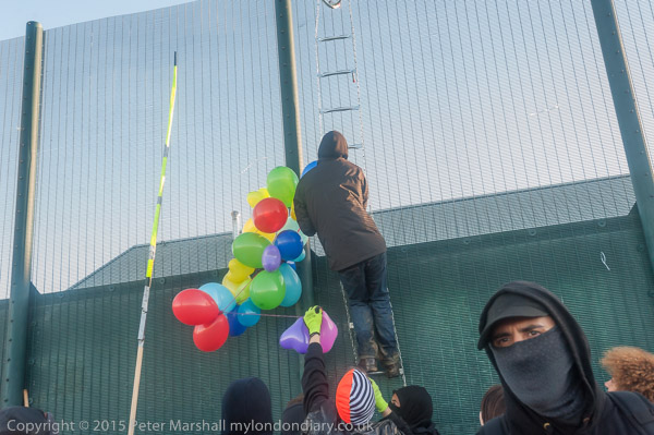 ![]() People bring balloons to the fence ![]() and take them to the top of the fence ![]() ![]() ![]() ![]() The crowd stands on the hill in late winter afternoon sun ![]() as I leave while the protest is still continuing ![]() and make my way along the footpath - here the end of a byway ![]() back to the road. On the other side is a very large field and though it's sunny, a cold wind blows across it. |