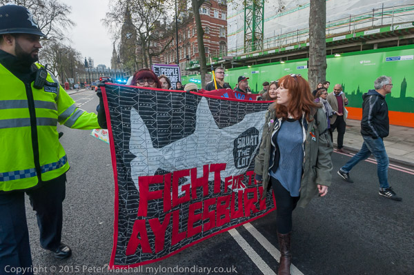 A police officer risks trying to move the 'Figth for the Aylesbury banner to the nearside lane