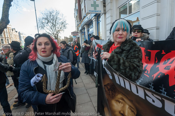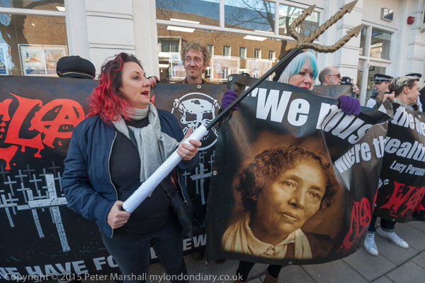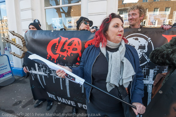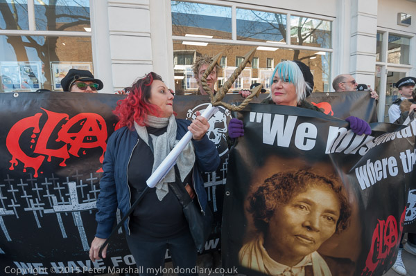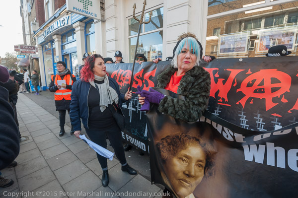 Class War leave the march to protest outside an estate agents. Lisa McKenzie with her trident