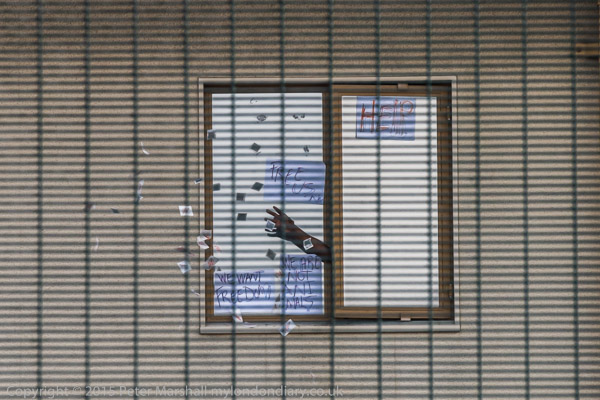 ' Help!' 'We Want Freedom' 'Free Us Now' 'We are not animals' and the hand throws a cluster of tea bags out of the window