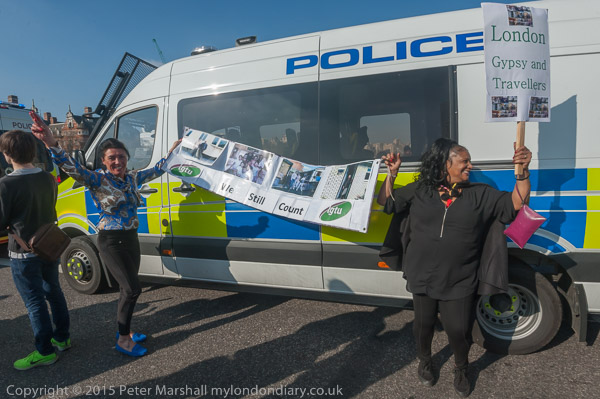 People form the London Gypsy and Traveller Unit pose in front of a police van
