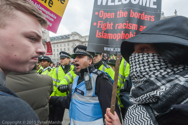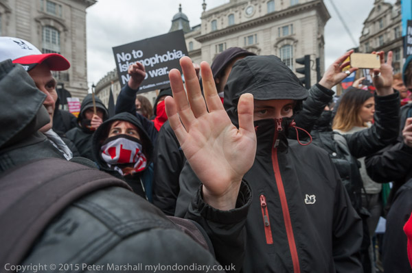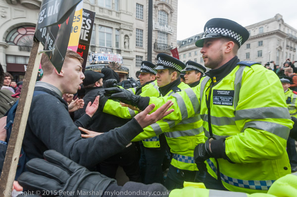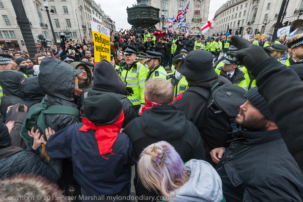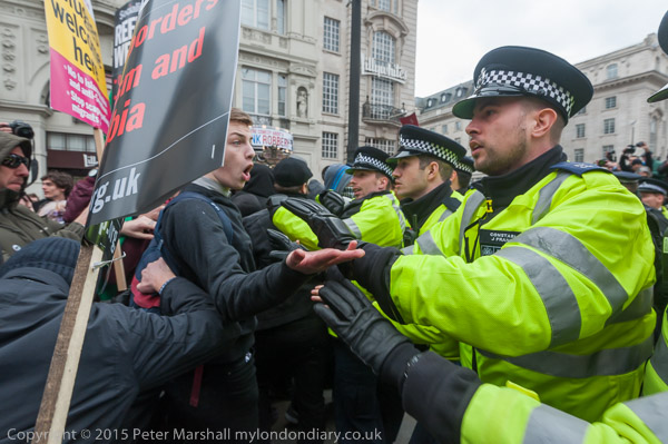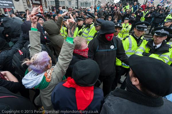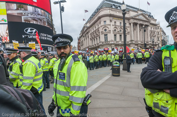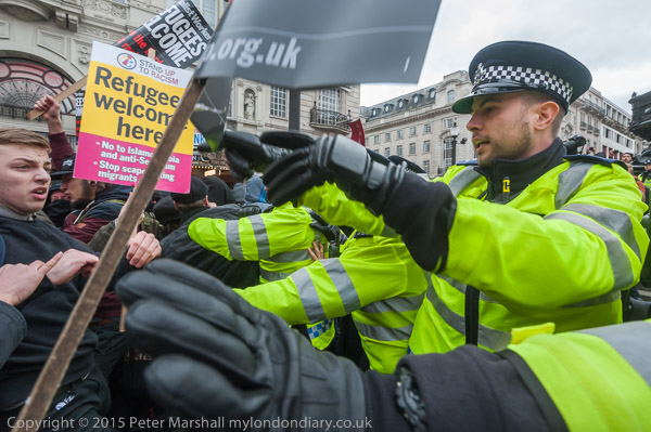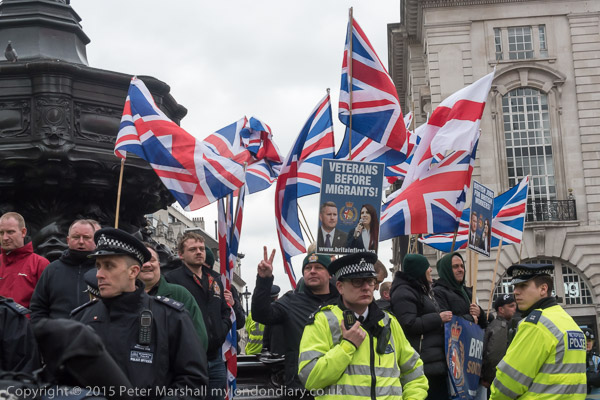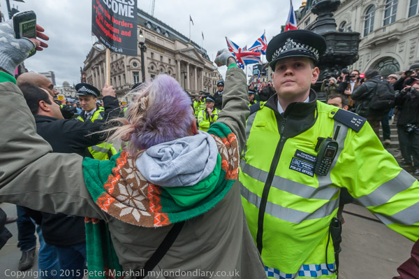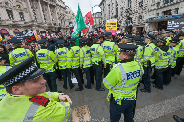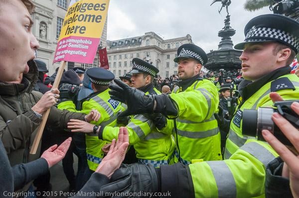 Police stop anti-fascists approaching the small Britain First ultra-right protest at Piccadilly Circus