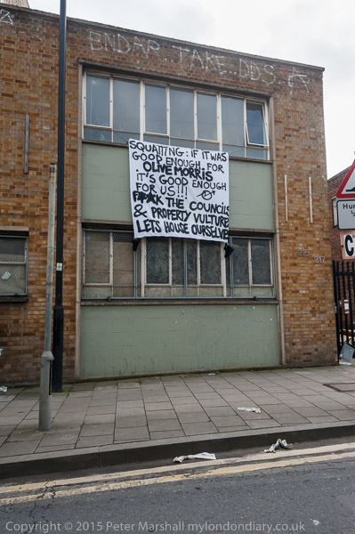 a commercial building which had a sign about squatting 'If it was good enough for Olive Morris it's good enough for US!!!'