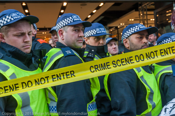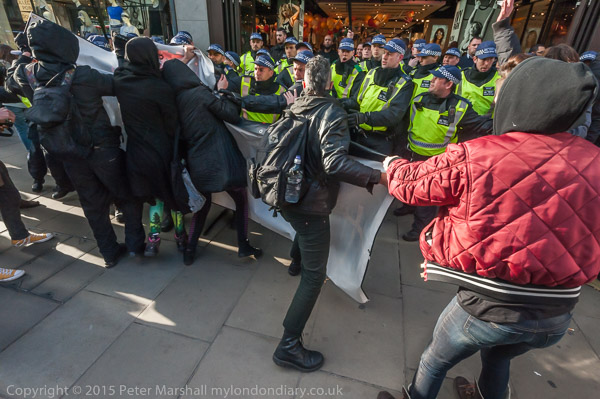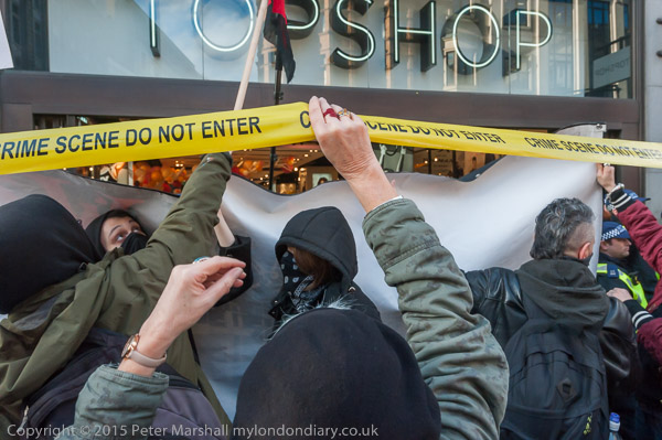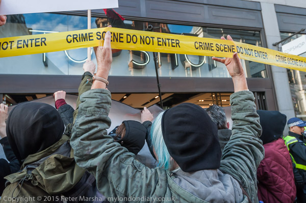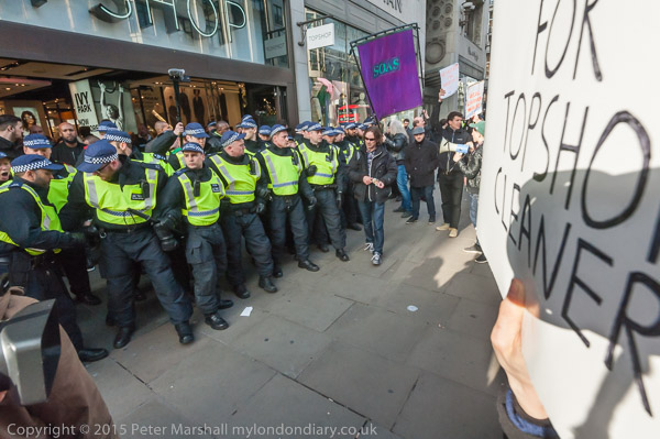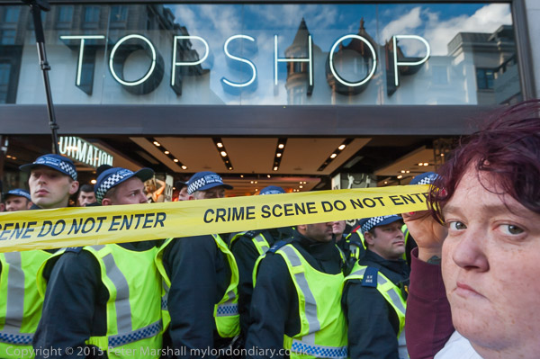 Protesters hold up posters as they face police guarding the side door of Topshop