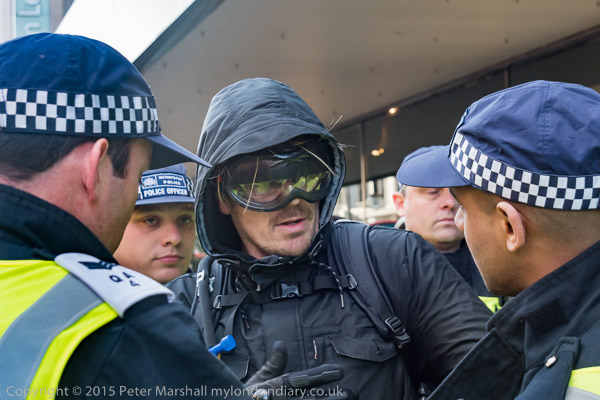 and force him to remove his hood and goggles, threatening him with arrest. Some of the police have followed