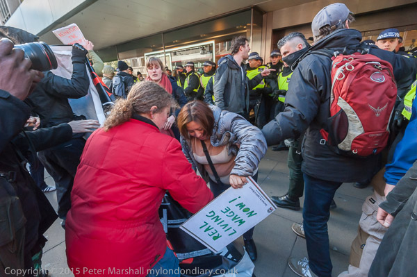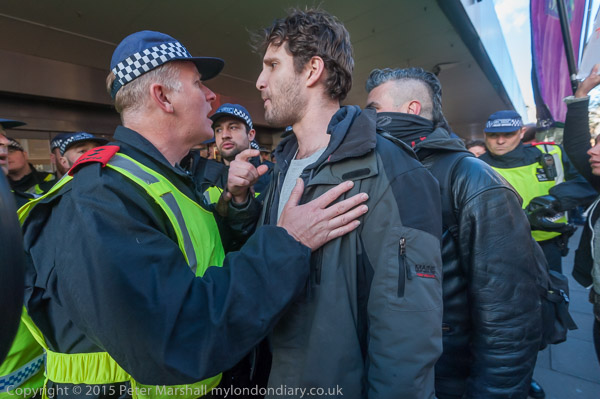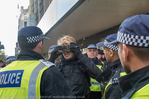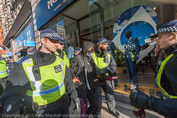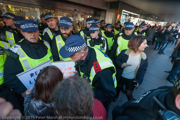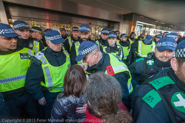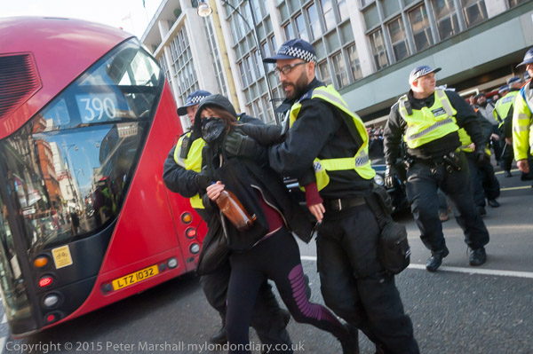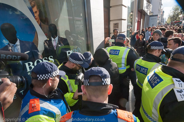 Suddenly, as people were walking away, police grab one protester and drag her across Oxford St