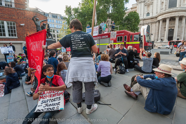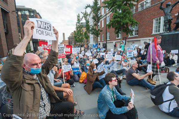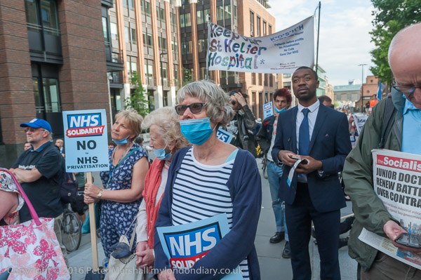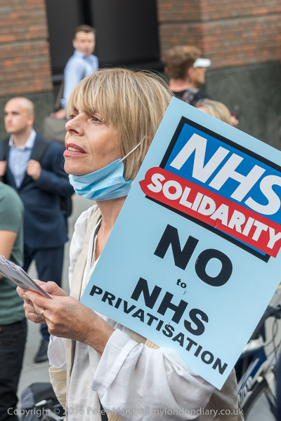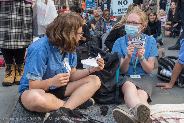 Junior doctor Aislinn Macklin-Doherty hands out posters reading 'NHS for Sale'