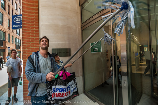and mop the glass door and windows in a noisy protest