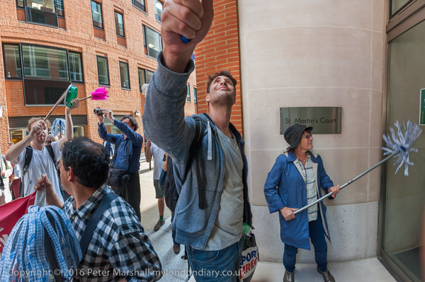 The protest pauses briefly on the road close to the front entrance of the CBRE offices in St Martin's Court