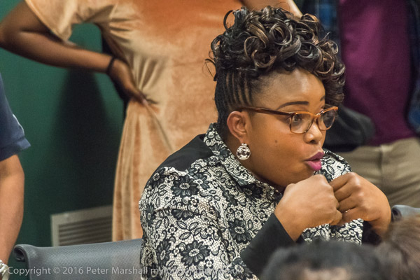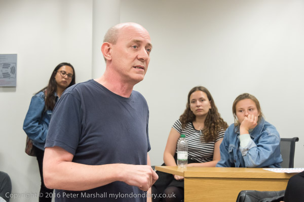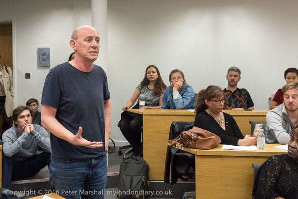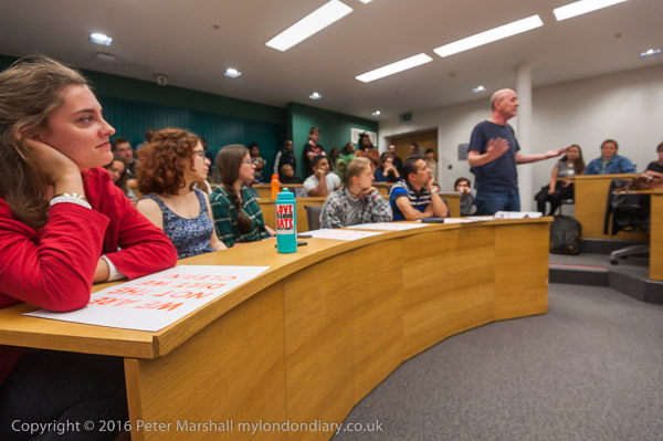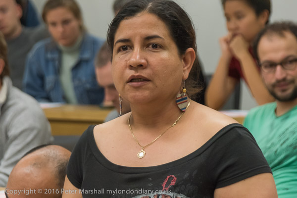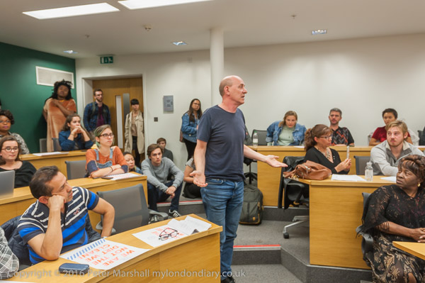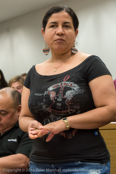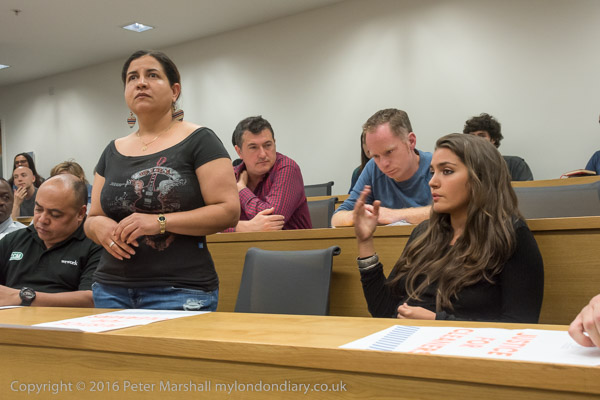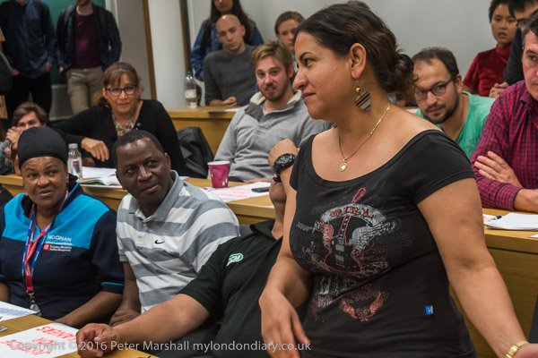 Sandy Nicoll from SOAS Unison tells the meeting about their 10 year fight to bring the cleaners in-house