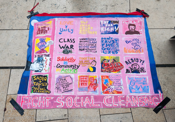 A FRFI banner 'Fight Social Cleansing' taped to Windrush Square
