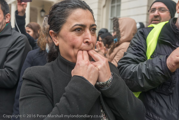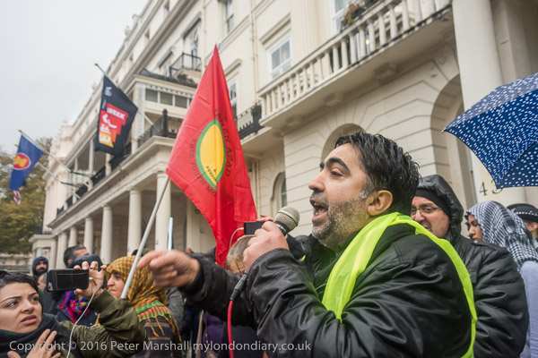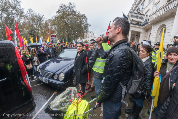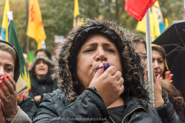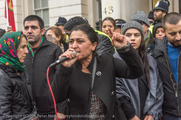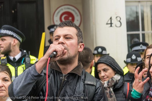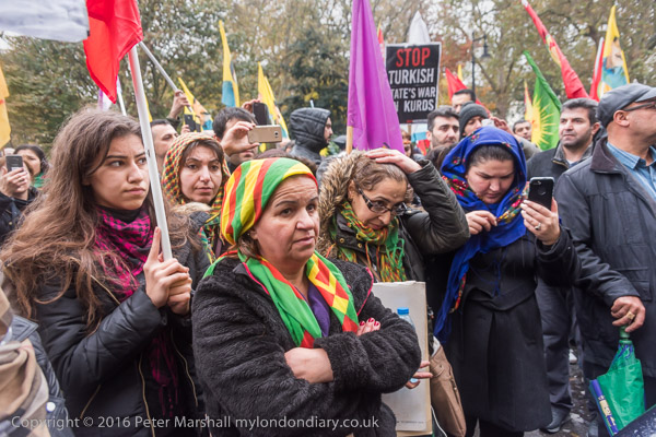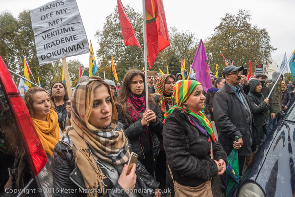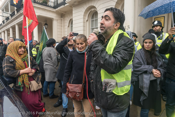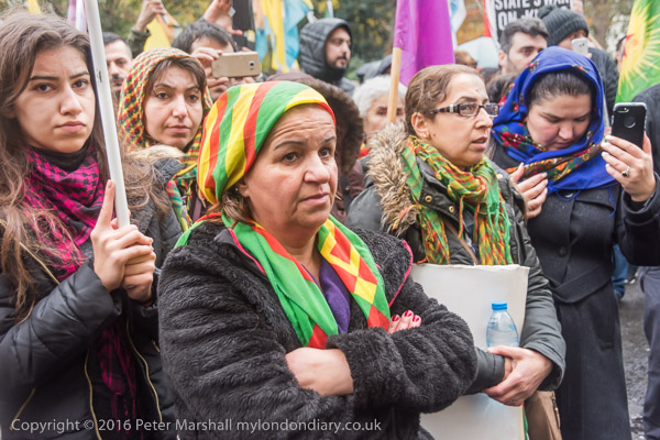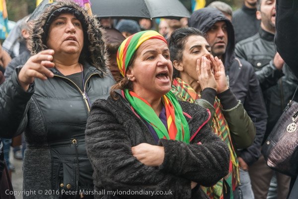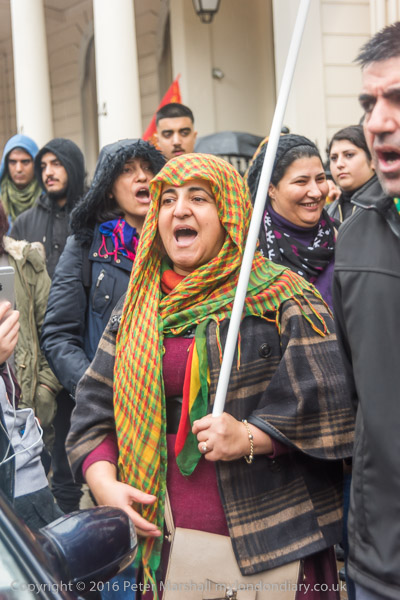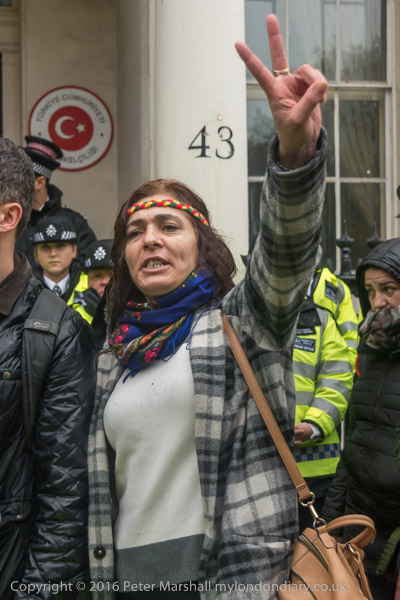 A block of police is behind the Kurds on the embassy steps