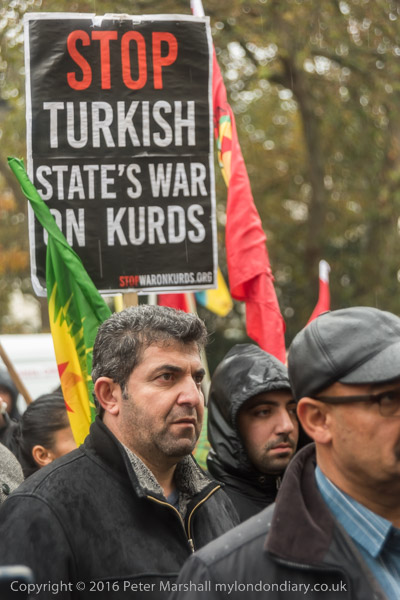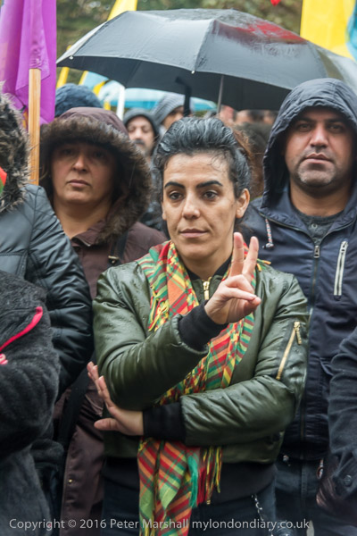 People listen to speeches in front of the Turkish embassy in the rain